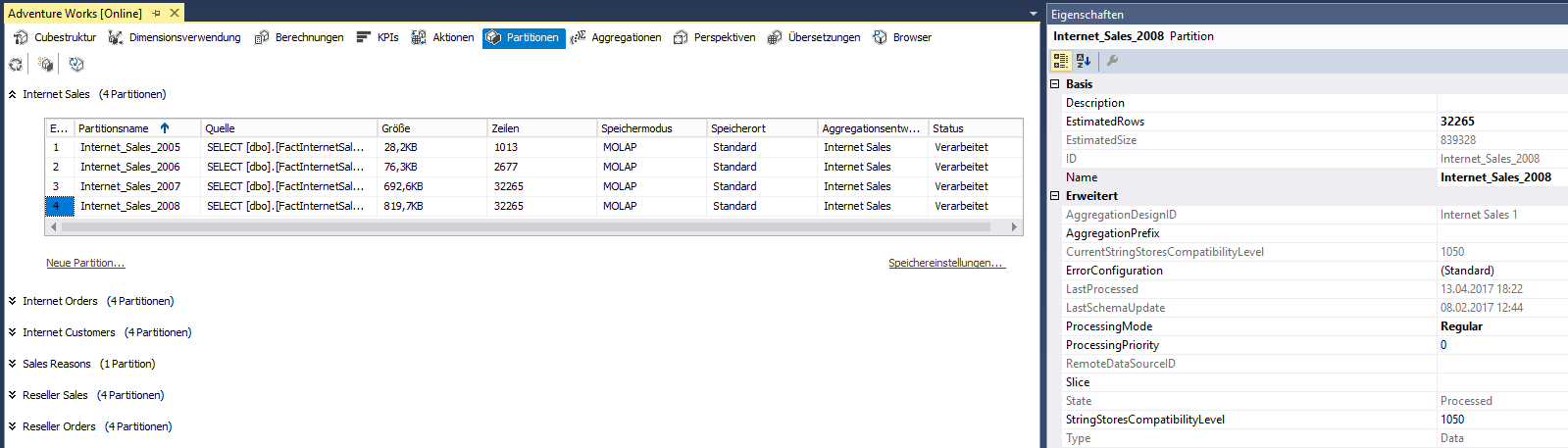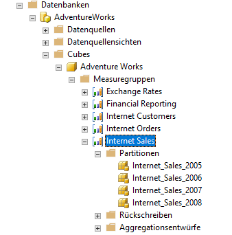 Im Folgenden werden wir uns dem Thema zunächst allgemeingültig über die allseits bekannte Adventure-Works-Datenbank von Microsoft nähern. In der Measuregruppe „Internet Sales“ sind 4 Partitionen nach den Jahren 2005-2008 definiert worden.