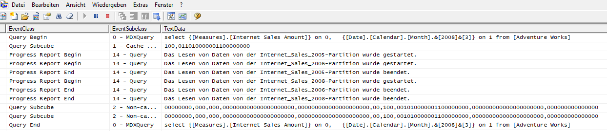 Der geneigte Leser erwartet sicherlich über die Ablaufverfolgung im Profiler eine einzige Abfrage zu sehen. Doch weit gefehlt, der Server liest sämtliche Partitionen aus, obwohl in der Abfrage explizit ein Monat aus 2008 angegeben wurde.