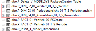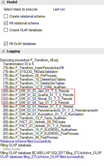 Für die Fakten funktioniert die „Live-Deaktivierung“ hingegen immer. Hier wird sowohl in den P_FACT-Routinen selbst, als auch in der Iteration des Schritts „Fill relational schema“ geprüft, ob die jeweilige Measure Group aktiv ist. Nach einer Deaktivierung taucht der Schritt, anders als bei den Dimensionen, auch nicht mehr im Log auf.