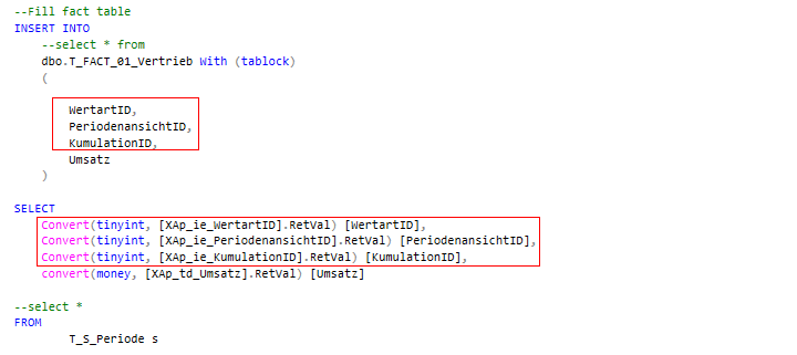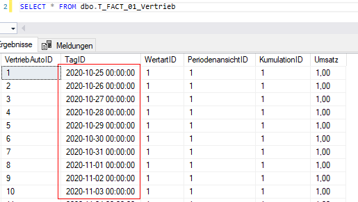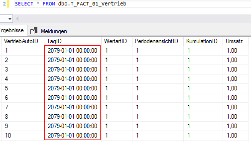 Was zunächst auffällt ist, dass die Befüllungsroutinen trotz Deaktivierung weiterhin im Log auftauchen. Dies ist korrekt und durchaus beabsichtigt. Warum das so ist, kann ein Vorher-Nachher-Vergleich der befüllten Faktentabelle erklären. Nach einer Befüllung mit aktivierter Dimension sieht die Faktentabelle folgendermaßen aus:
