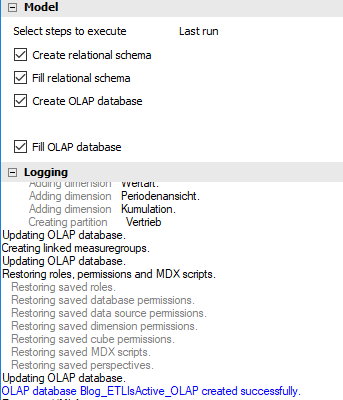 Wie bereits einleitend erwähnt, werden deaktivierte Objekte im Modellaufbauprozess nicht berücksichtigt. Das betrifft alle Schritte des Modellaufbaus, sprich „Create relational schema“, „Fill relational schema“ sowie „Create OLAP database“ (und in der Folge auch „Fill OLAP database“). Im Ergebnis sieht es so aus, als wäre das Modell ohne das deaktivierte Objekt erstellt worden.