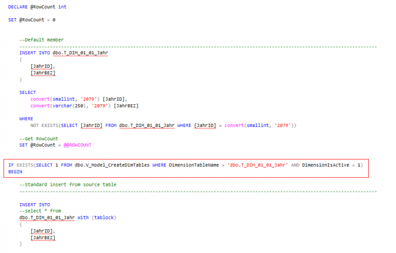 Damit dies funktioniert, ist natürlich die oben entdeckte Ausführung der Dimensionsprozeduren notwendig. Hier wird im Falle einer deaktivierten Dimension allerdings nur das Default-Element eingefügt (sofern noch nicht vorhanden), die restlichen Elemente werden nicht geladen. Dafür sorgt ein neuer IF-Block in den entsprechenden P_DIM-Routinen: