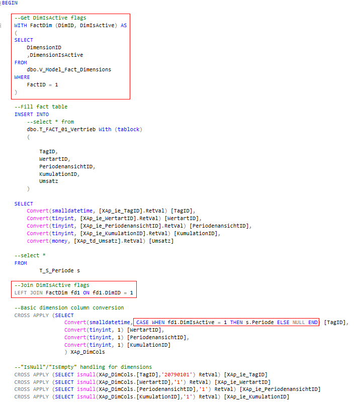 Der zweite Teil der „Magie“ liegt in den P_FACT-Routinen. Hier müssen die Daten im Falle einer Deaktivierung immer auf das Default-Element umgeleitet werden. Dafür müssen zwei Dinge passieren. Es muss (live) geprüft werden, ob eine Dimension aktiv oder inaktiv ist und dann an der entsprechenden Stelle statt dem „echten“ Element das Default-Element verwendet werden. Die entsprechenden Code-Blöcke sind hier exemplarisch zu sehen: