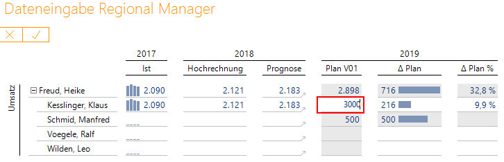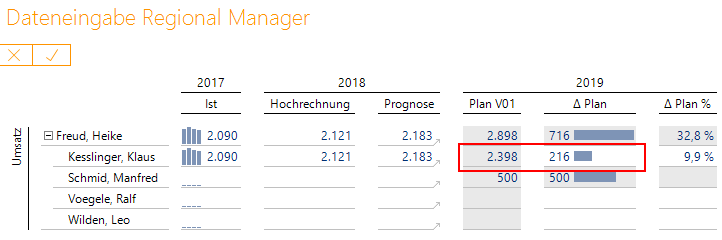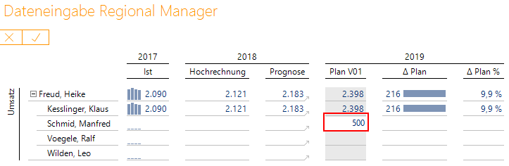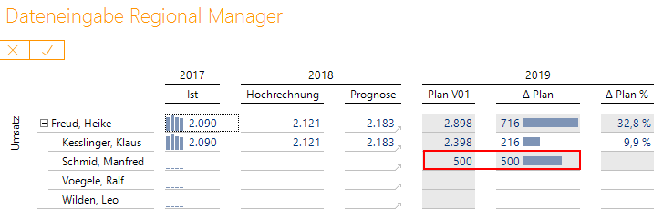Schauen wir uns nun an, wie sich die Planungsanwendung verhält, wenn wir mit der Konfiguration ins Rennen gehen. Hierfür haben wir einen kleinen Bericht vorbereitet, der uns die Eingabe in einem kleinen Datenraum ermöglicht. Zunächst wollen wir neue Daten bei Herrn Schmid eintragen: