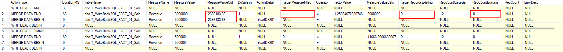 Im zweiten fehlerhaften Schreibvorgang ergeben die ermittelten Steuerkennzeichen ein inkonsistentes Bild. Der MeasureValueOld wird übergeben (die Zelle ist ja gefüllt), weshalb das Kennzeichen „TargetMeasureFilled“ korrekterweise als 1 ermittelt wird. Bei der anschließenden Prüfung der Daten in der Zieltabelle werden aber keine Datensätze gefunden. Das Flag „TargetRecordsExisting“ sowie der Zähler „RecCountExisting“ sind beide 0. Und genau hier kommt das Problem her. In der Rückschreibroutine wird der Pfad für existierende Werte eingeschlagen. Beim anschließenden Versuch den Datenraum zu laden, der nun verändert werden soll, werden keine Daten in der Rückschreibtabelle gefunden. Damit greift der Schreibversuch ins Leere.