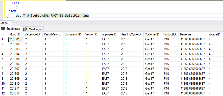 Beim Übertrag der Daten aus der T_FACT in die T_WriteBackSQL ist lediglich darauf zu achten, dass man nur die geladenen Vorschlagswerte überträgt und nicht versehentlich alte Plan- oder Istwerte. Hier gilt ähnliches wie beim Löschen. Die Werte müssen über die richtigen Dimensionen identifiziert werden. Alternativ kann man sich auch hier gut mit einem Filter auf SourceID = 3 behelfen, da man davon ausgehen kann, dass außer dem aktuellen Lauf keine alten Vorschlagswerte in der Faktentabelle enthalten sind.