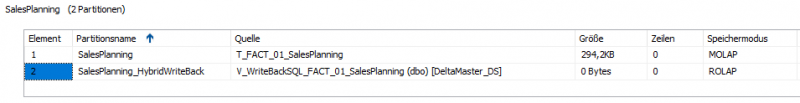 Schauen wir uns zunächst die Grundlagen anhand einer leicht modifizierten Chair-International-Datenbank an. Hinter jeder Planungs-MeasureGroup liegen zwei (bei normalem Hybrid) oder drei Partitionen. Die normale T_FACT-Partition, die in der Regel die Ist-Daten und evtl. historische Planungen enthält. Weiterhin die V_WriteBackSQL-Partition. In normalen Hybrid-Lösungen werden hier alle Plandaten mit den echten Zellwerten gespeichert und die Partition ist per ROLAP angebunden. In Delta-Hybrid-Lösungen liegen hier die verdichteten Planwerte per MOLAP-Anbindung und es gibt weiterhin noch die V_WriteBackSQL_Delta-Partition, welche die Veränderungen gegenüber den MOLAP-Planwerten enthält und auf ROLAP basiert.
