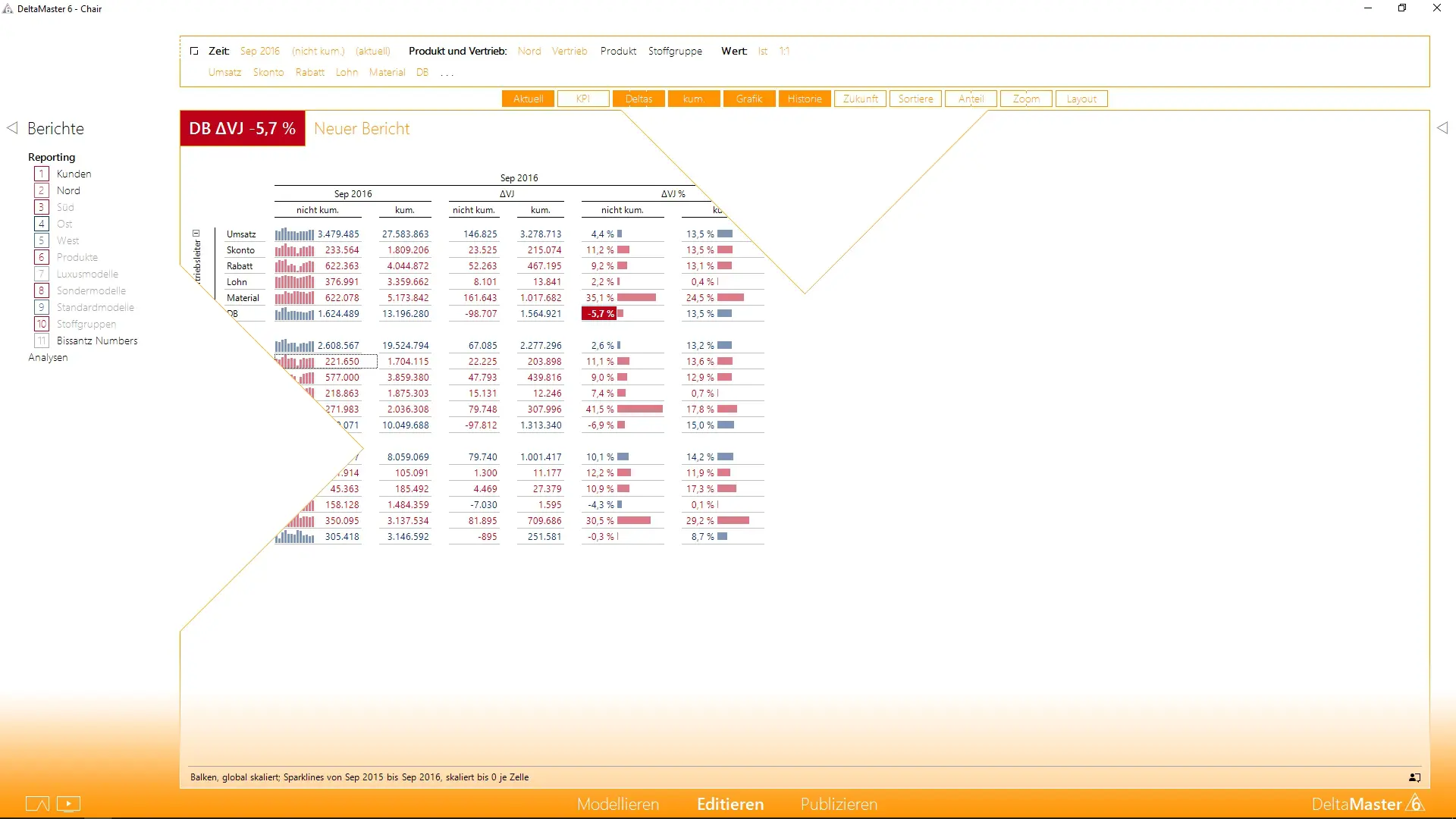 DeltaMaster ist ein Drag-and-drop-Produkt: Alle wichtigen Aktionen zur Nutzung und Erstellung von Berichten funktionieren mit einfachen, intuitiven Mausbewegungen. Selbst ungeübte Anwender können dadurch in kürzester Zeit Berichte und Ad-hoc-Analysen anfertigen. Das wichtigste Berichtsformat in DeltaMaster sind Grafische Tabellen – und das wichtigste Werkzeug die Magischen Knöpfe: Mit diesen Bedienelementen lassen sich vernünftige, aussagekräftige, gut gestaltete Berichte mit wenigen Klick erzeugen. Magisch sind die Knöpfe, weil sie sich automatisch so verhalten, wie es zur jeweiligen Datenlage passt, und die wichtigsten betriebswirtschaftlichen Fragen zur Erfolgskontrolle, Abweichungsanalyse und Vorschau fast von alleine beantworten.